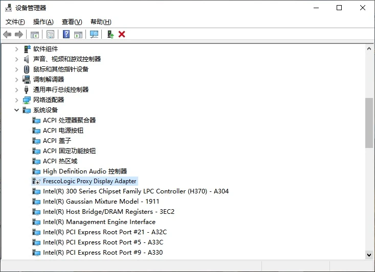 想解决这个问题,你需要在设备管理器中禁用 (或者卸载?) 驱动程序,位于设备管理器→系统设备→FrescoLogic 代理显示适配器 / FrescoLogic Proxy Display Adapter,如下图所示: