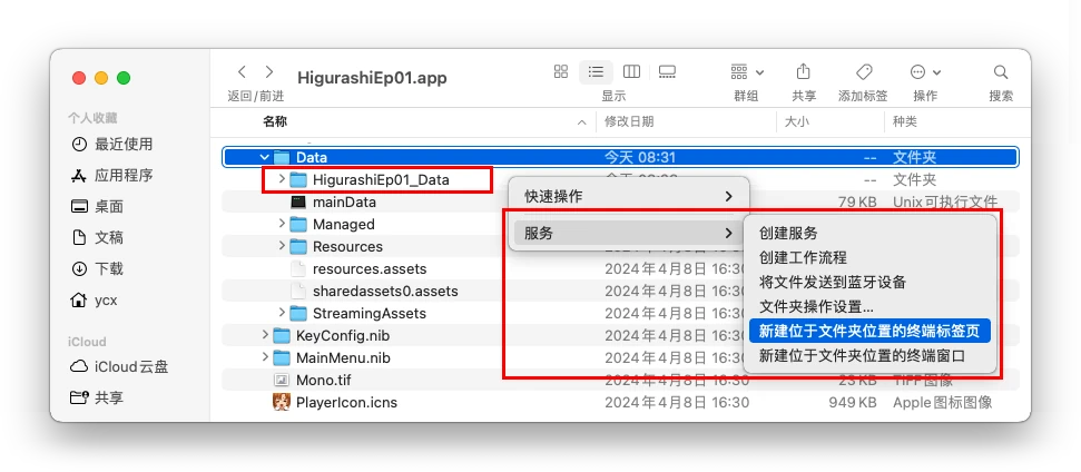 Resources/Data文件夹,右键点击Data文件夹,选择服务→新建位于文件夹位置的终端标签页/窗口(两个选项都可以)。